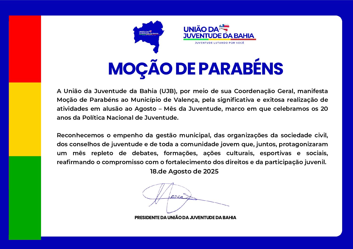 🏆A Prefeitura de Valença, por meio da Secretaria de Juventude e Esporte, recebeu Moção de Parabéns da União da Juventude da Bahia pelo sucesso das ações do Agosto – Mês da Juventude, celebrando os 20 anos da Política Nacional de Juventude!👏🏽👏🏽👏🏽Reconhecendo o empenho da gestão municipal, das organizações da sociedade civil,dos conselhos de juventude e de toda a comunidade jovem que, juntos, protagonizaram uma semana repleta de debates, formações, ações culturais, esportivas e sociais,reafirmando o compromisso com o fortalecimento dos direitos e da participação juvenil.🫡💪