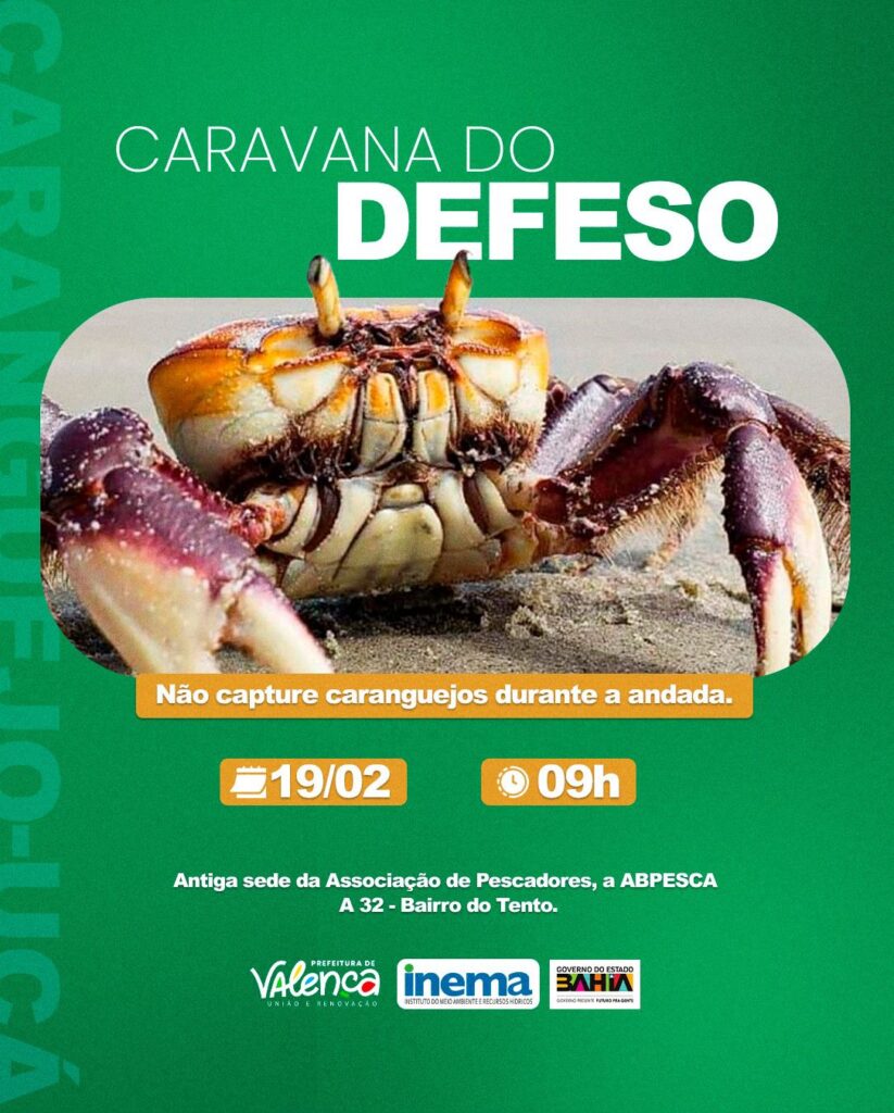 Aqui em Valença, a ação vai estar na próxima quarta-feira (19), às 9 horas, na antiga sede da Associação de Pescadores, a ABESCA A 32, Bairro do Tento, levando informações através de rodas de conversa entre especialistas e populares, sensibilizando sobre o período de defeso do caranguejo-uçá (Ucides cordatus), quando a captura, transporte, beneficiamento e comercialização dos crustáceos ficam proibidos, reforçando a proteção da espécie e ciclo reprodutivo.