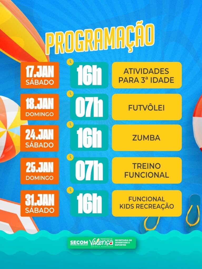 A programação começa ainda em janeiro, abrindo o calendário de verão com ações que unem esporte, dança e recreação. No último sábado (17/01), às 16h, a praia recebe atividades voltadas para a 3ª idade. Já no domingo (18/01), às 7h, é a vez do futvôlei, trazendo o clima esportivo para o início da manhã. No sábado (24/01), às 16h, o ritmo toma conta da orla com a zumba, enquanto o domingo (25/01), às 7h, será dedicado ao treino funcional. Encerrando o mês, no sábado (31/01), às 16h, a programação contempla a criançada com funcional kids e recreação.