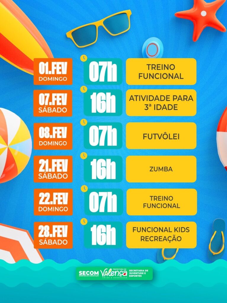 Em fevereiro, a animação continua firme nos fins de semana. O domingo (01/02), às 7h, abre o mês com treino funcional. No sábado (07/02), às 16h, retornam as atividades para a 3ª idade, reforçando o cuidado com o bem-estar. O domingo (08/02), às 7h, traz novamente o futvôlei, seguido pela zumba, no sábado (21/02), às 16h. No domingo (22/02), às 7h, o treino funcional volta a ocupar a praia, e o encerramento acontece no sábado (28/02), às 16h, com funcional kids e recreação, garantindo diversão para toda a família. As atividades acontecem em frente a Pousada Saveiro.