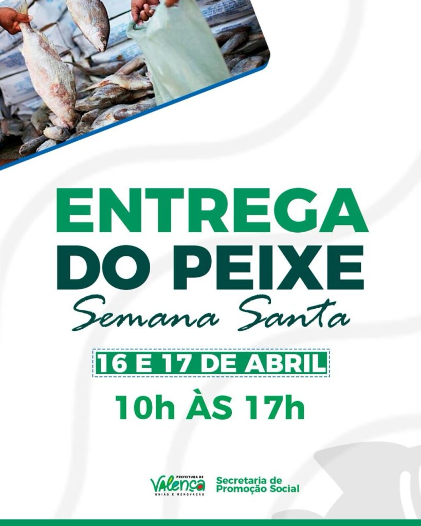 A Prefeitura de Valença informa a entrega de pescados para os moradores da sede e das comunidades rurais do município. A distribuição acontecerá em dois dias, quarta (16) e quinta-feira (17) de abril, das 10h às 17h, com diversos pontos de entrega organizados para atender à população de forma ampla e descentralizada. Serão 20 toneladas de peixes distribuídas para 10 mil famílias que atualizaram ou fizeram o cadastro nos Cras durante o período de recadastramento. Para o Prefeito Marcos Medrado, esse é um momento de reflexão e fé. E é por isso que a tradicional distribuição de peixe tem um significado tão especial para todos. “Mais do que um gesto simbólico, essa ação representa o compromisso da nossa gestão com as famílias valencianas, principalmente aquelas que mais precisam”, ressaltou.Além disso, essa ação também é um gesto de cuidado com as famílias em situação de vulnerabilidade. Segundo a Secretária de Promoção Social, Cris Macedo, “é uma forma de garantir dignidade à mesa e reforçar os laços de solidariedade em nossa comunidade.”SECOM PMV