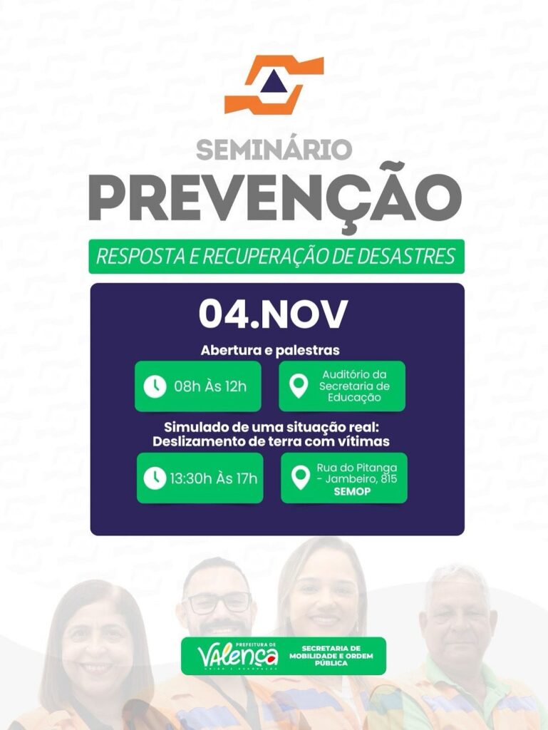 A Prefeitura de Valença, por meio da Diretoria Municipal de Proteção e Defesa Civil, convida a população para participar do Seminário em alusão ao Dia Internacional para a Redução do Risco de Desastres, que será realizado no dia 04 de novembro, com o tema “Prevenção, Resposta e Recuperação de Desastres”.